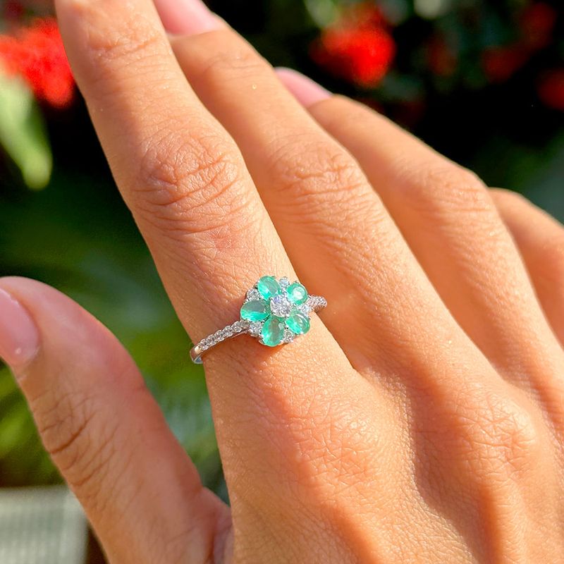 Esse anel flor é puro encanto! Cristal Paraíba brilha no centro e ao redor de zircônias brancas completam o charme em Prata 925. Um toque romântico e sofisticado para arrasar em qualquer ocasião.