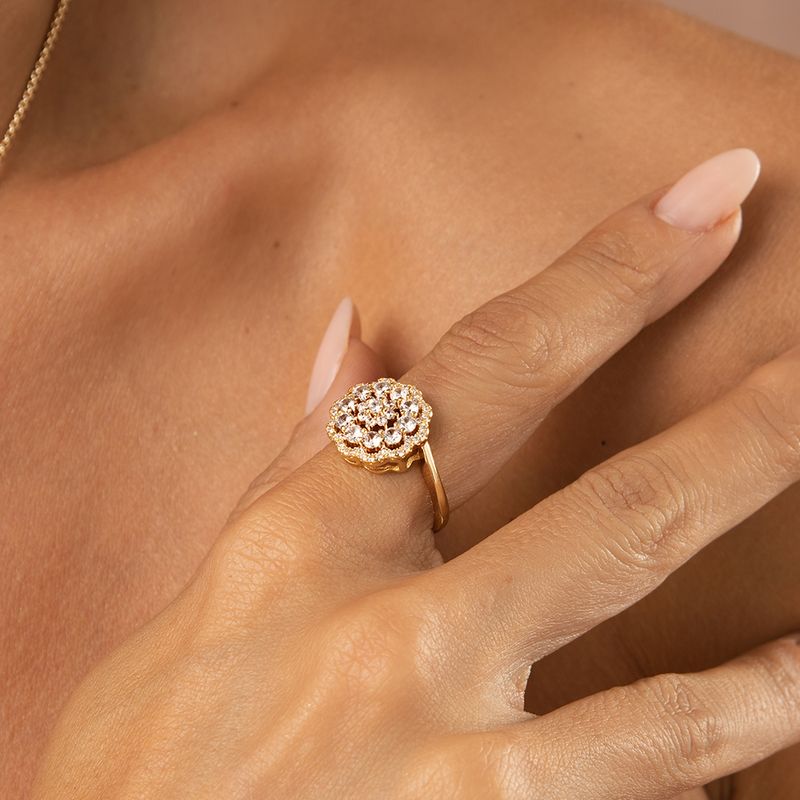 O anel flor com zircônias brancas traz um brilho delicado e romântico em um design moderno e elegante. O formato da flor ganha destaque com o banho de ouro 18k, que deixa a peça luminosa e sofisticada. Leve, confortável e cheio de charme, é perfeito para quem ama acessórios femininos com um toque jovem e super estiloso.