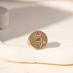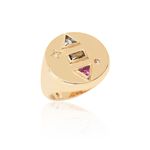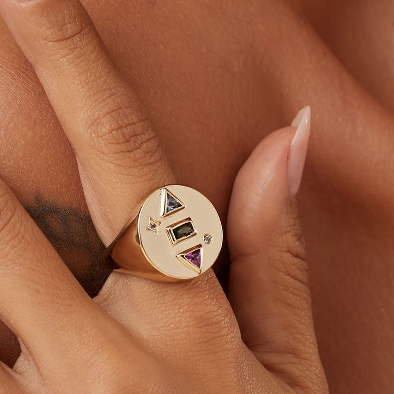 O anel geométrico round em banho de ouro 18k combina três cristais em destaque: turmalina rosa, peridoto e london blue. Uma joia sofisticada, moderna e cheia de cor, perfeita para quem busca estilo ousado e elegante em cada detalhe.