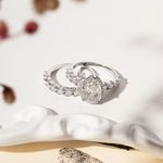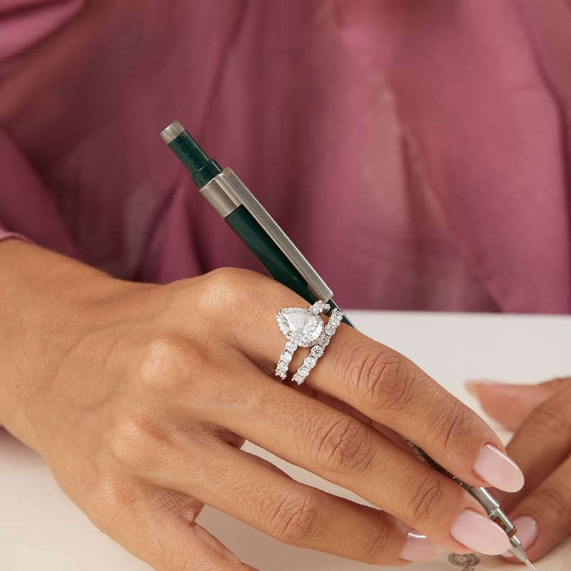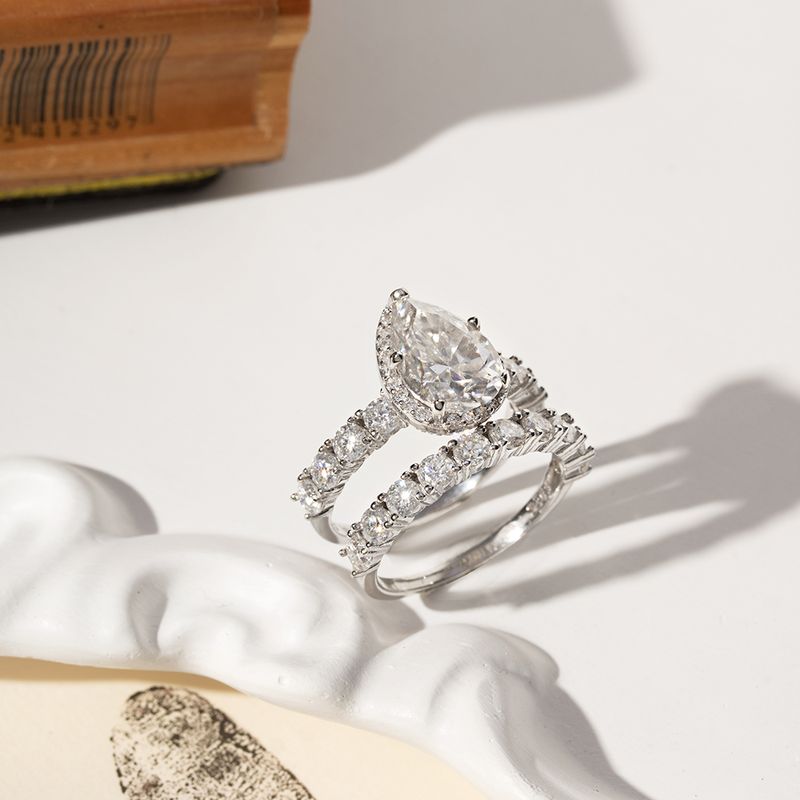 O anel em Prata 925 exibe design duplo e elegante com Moissanite lapidação gota 12x8mm (0,25CT / 25 pontos), cor D — a mais clara da escala GIA — e pureza VVS1. O brilho das zircônias brancas complementa a sofisticação. Acompanha certificado GRA de autenticidade.