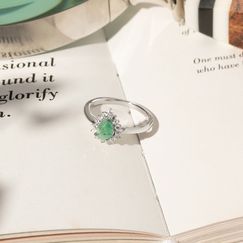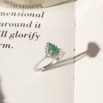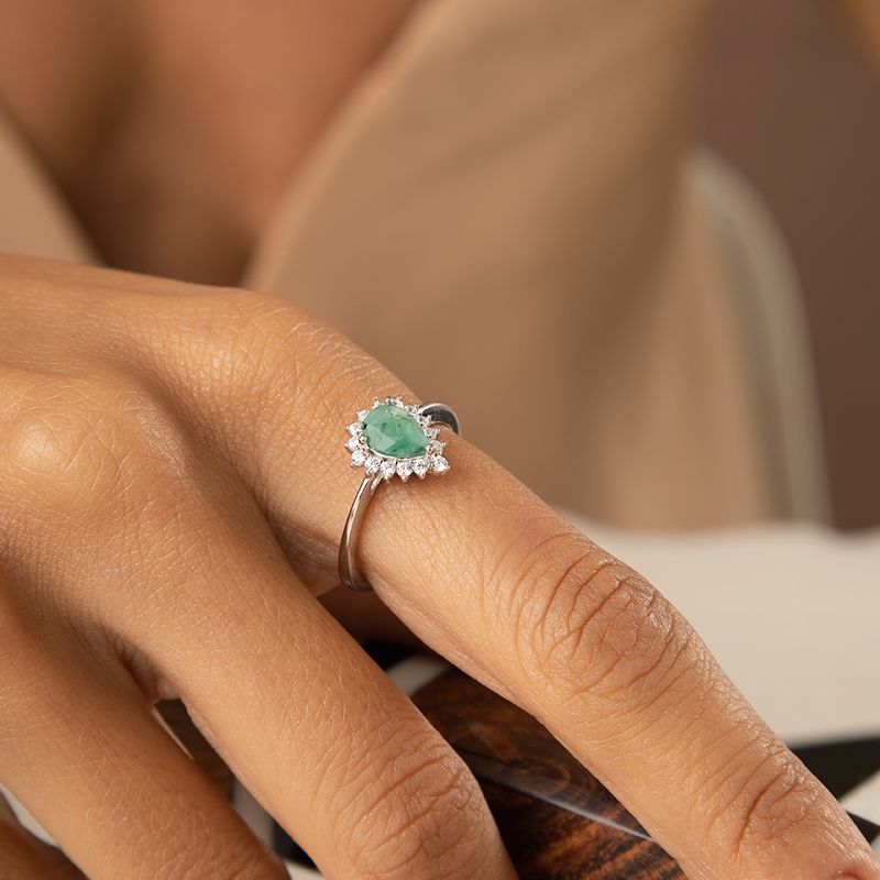 O anel é um clássico da alta joalheria! No centro, uma esmeralda natural em lapidação gota de aproximadamente 0,65 ct exibe um verde intenso e encantador, emoldurada por moissanites melee de 1,5mm na cor D e pureza VVS1, que proporcionam brilho comparável ao diamante. Produzido em prata 925 com acabamento premium, combina luxo e delicadeza em um design atemporal.