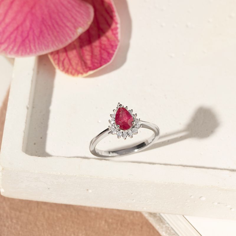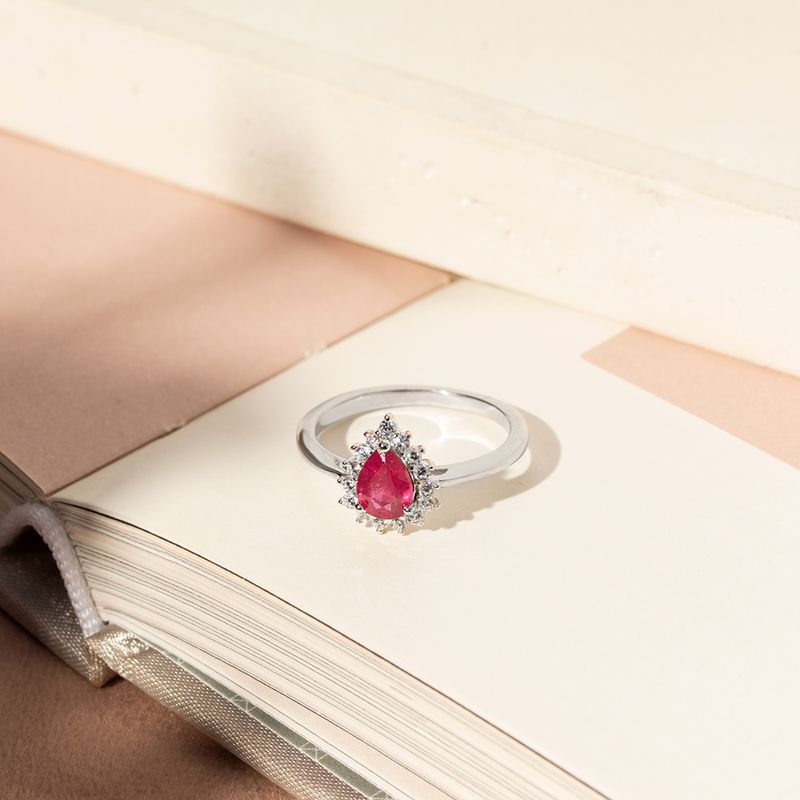 O anel é a definição de elegância e paixão! No centro, um rubi natural em lapidação gota de aproximadamente 0,9 ct exibe um vermelho intenso e vibrante, rodeado por moissanites melee de 1,5mm na cor D e pureza VVS1, que proporcionam brilho radiante e sofisticado. Produzido em prata 925 com acabamento de alta joalheria, o design equilibra luxo e delicadeza em uma peça atemporal