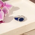 O anel Oval em banho de ródio branco é puro charme e elegância! Sua pedra Lápis-Lazúli Lab destaca-se pelo azul profundo e brilho natural, envolta por zircônias brancas que realçam sua beleza com delicadeza. O contraste entre o ródio e o azul traz um toque moderno e sofisticado, tornando esta joia perfeita para compor produções elegantes e atemporais.