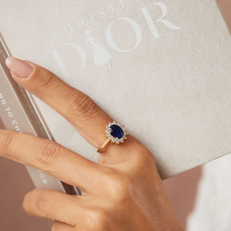O anel oval cravejado é puro glamour! O azul intenso do cristal safira brilha ainda mais com o contorno de zircônias brancas. O banho de ouro 18k dá o toque final de luxo, deixando essa joia irresistível para qualquer look.