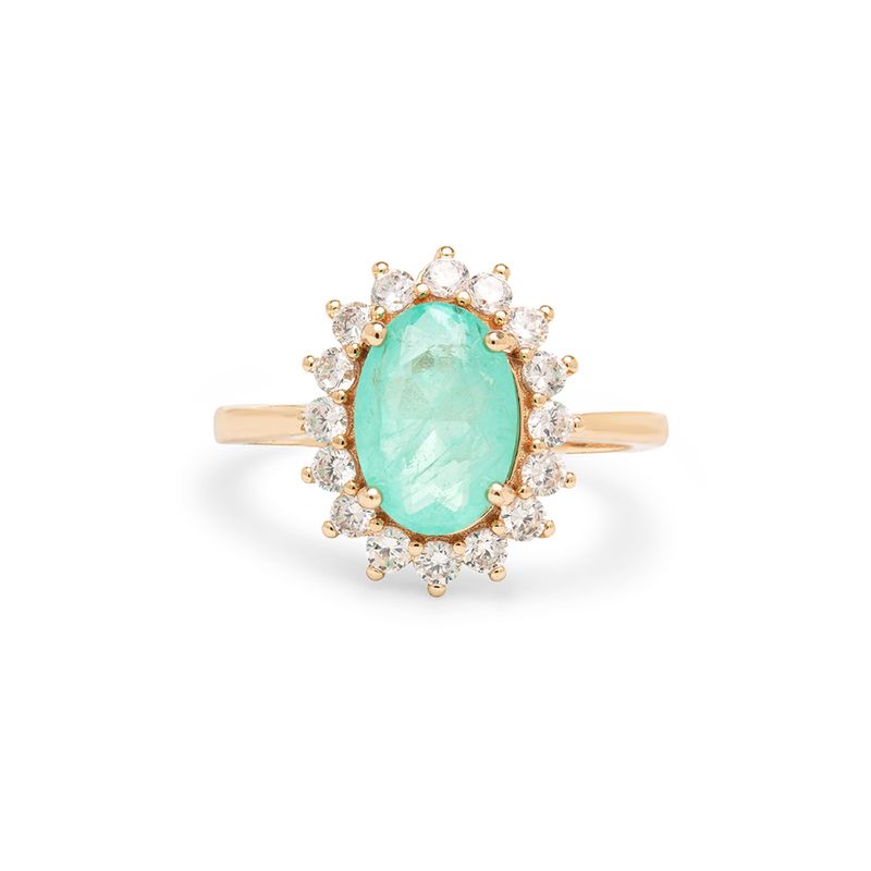 O anel em banho de ouro 18k traz pedra central oval de fusion turmalina, rodeada por zircônias brancas que destacam seu brilho e intensidade de cor. Uma joia sofisticada e elegante, ideal para compor produções marcantes e modernas.