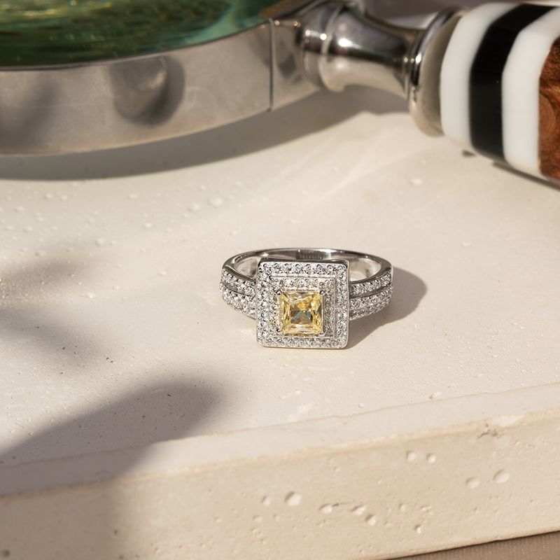 O anel Quadrado em Prata 925 é puro glamour! Sua zircônia central Diamond Lemon encanta com um tom amarelo-claro vibrante e sofisticado, destacada por delicadas zircônias brancas que realçam ainda mais o brilho. O design quadrado traz um toque moderno e luxuoso, perfeito para quem ama joias únicas e radiantes.