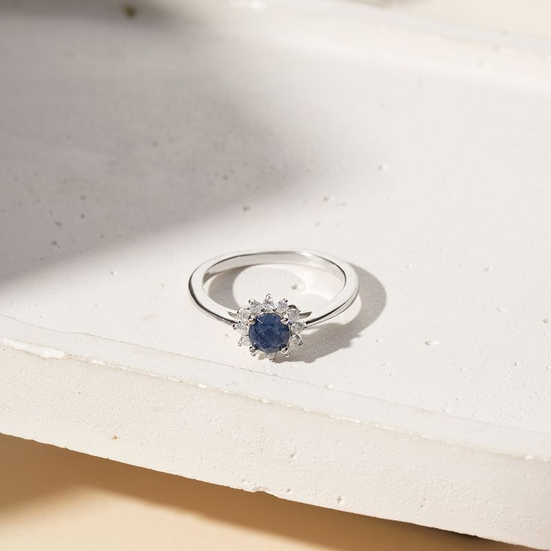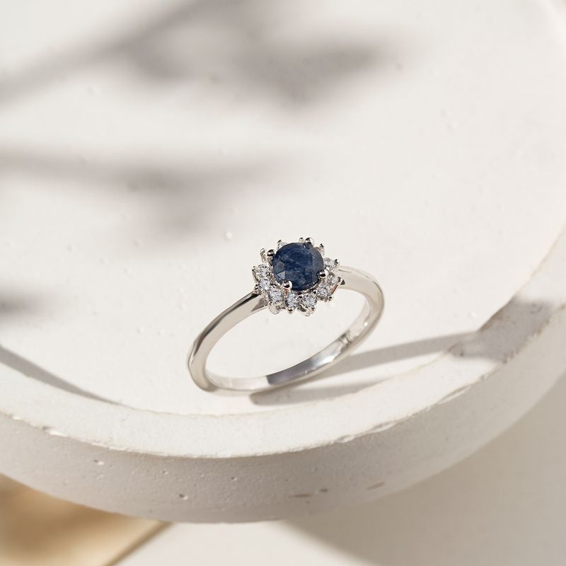 O anel em Prata 925 traz uma safira natural de 5mm (aprox. 0,7ct), rodeada por moissanites melee de 1,5mm em cor D — a mais clara da escala GIA — e pureza VVS1. A intensidade do azul profundo em contraste com o brilho cristalino cria uma joia sofisticada e única.