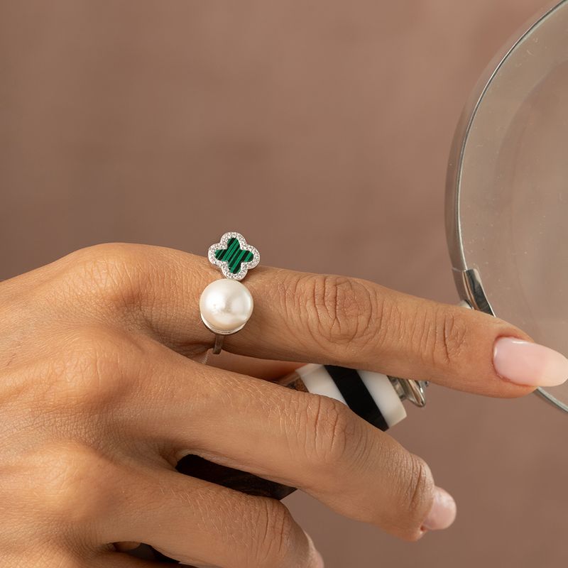 AnéisPrata 925Anel Trevo com Malaquita Lab e Zircônias Brancas - Prata 925