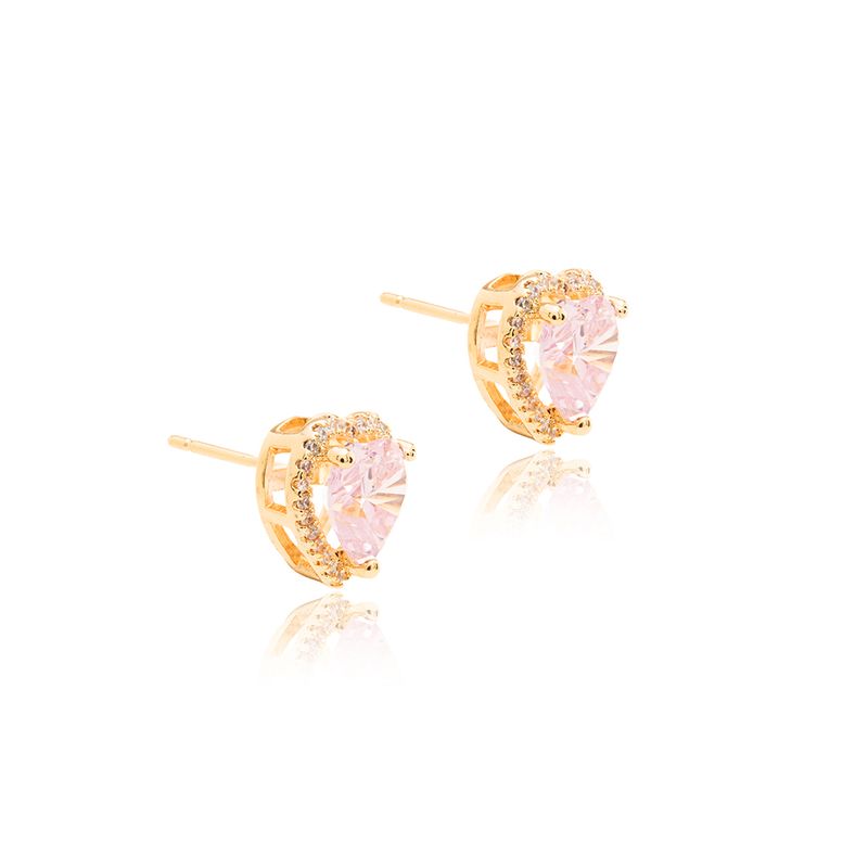 Brinco Coração Cristal Light Pink e Zircônias Brancas - Banho de Ouro 18k