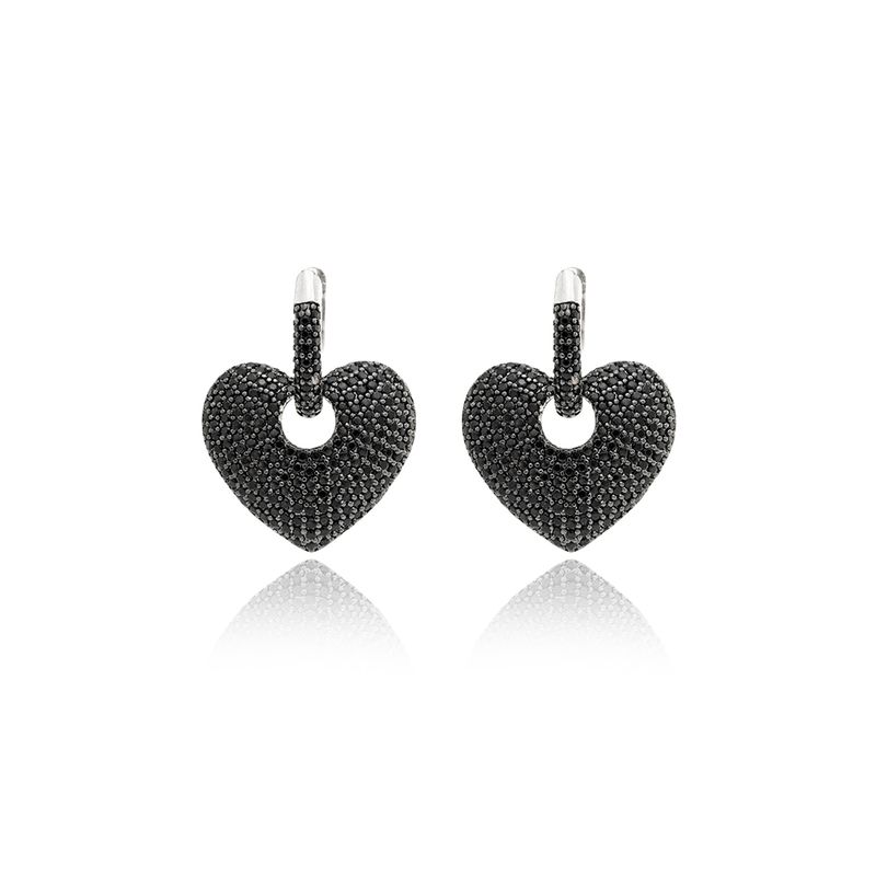 Brinco Coração de Zircônias Negras - Banho de Ródio Branco