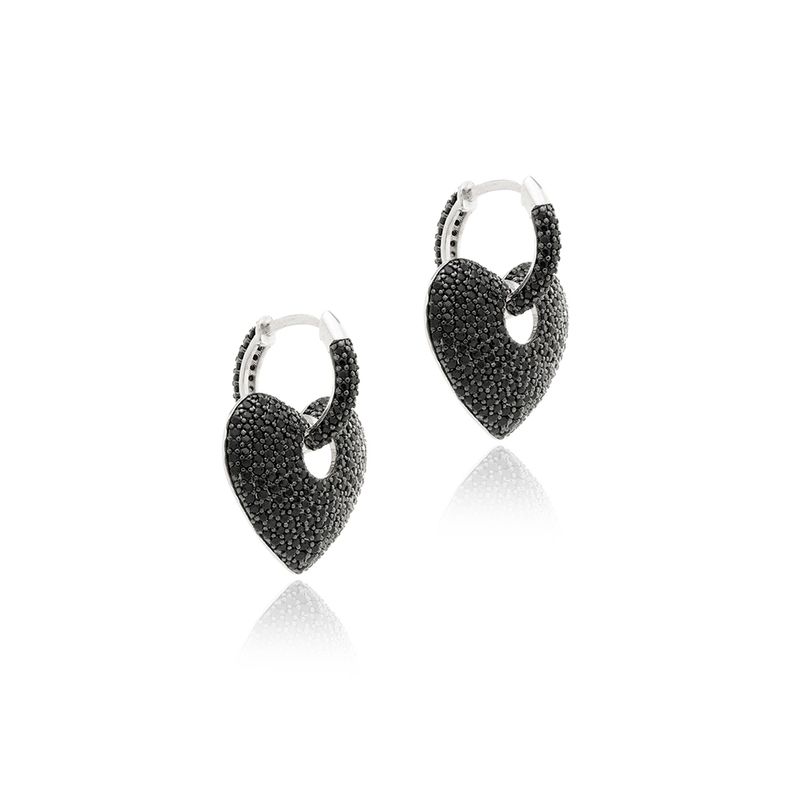 O brinco em banho de ródio branco apresenta formato de coração cravejado com zircônias negras. Uma joia moderna e elegante, perfeita para iluminar o rosto com um toque ousado e sofisticado.