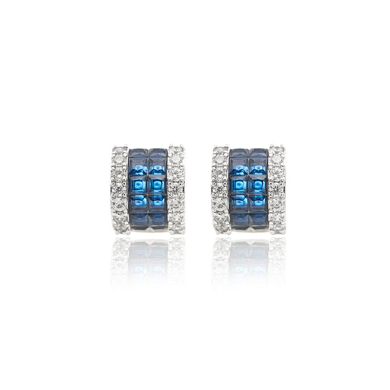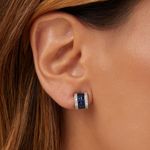 O brinco em banho de ródio branco apresenta design curvado com cravação invisível, intercalando zircônias safira e brancas. Uma joia sofisticada e moderna, que mistura brilho e cor em um detalhe delicado, ideal para iluminar o rosto com muito estilo.