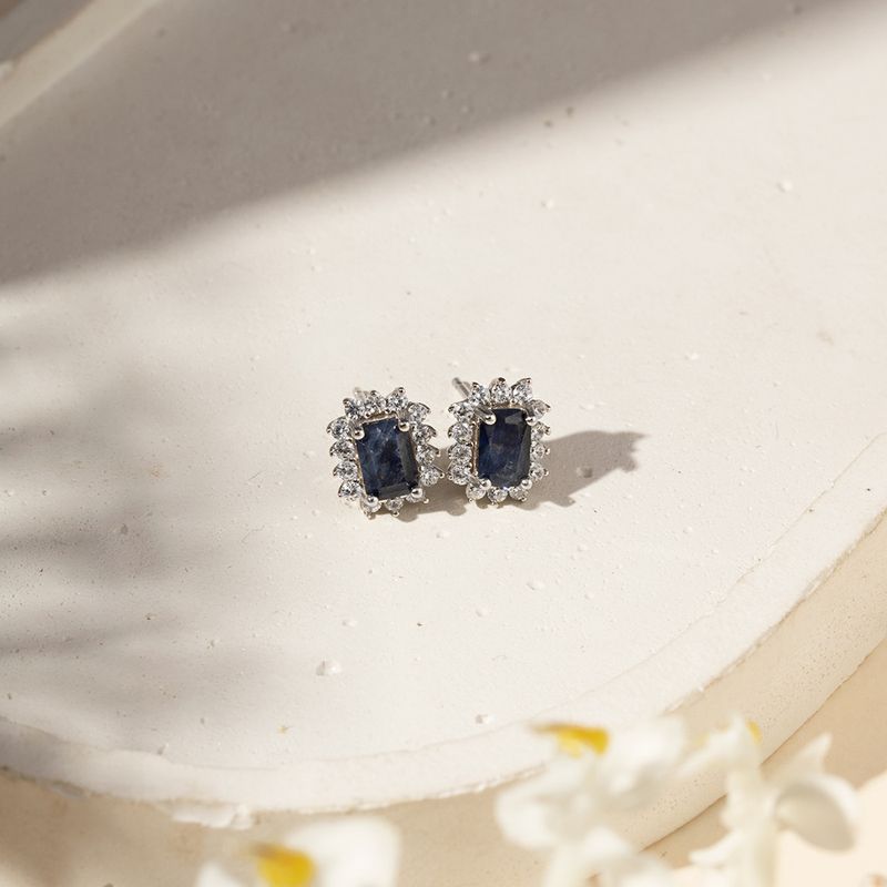 O brinco em Prata 925 traz a intensidade da safira natural 4x6mm (aprox. 0,75ct), emoldurada por moissanites melee de 1,5mm em cor D — a mais clara da escala GIA — e pureza VVS1. O contraste entre o azul profundo e o brilho cristalino cria uma joia sofisticada e atemporal.