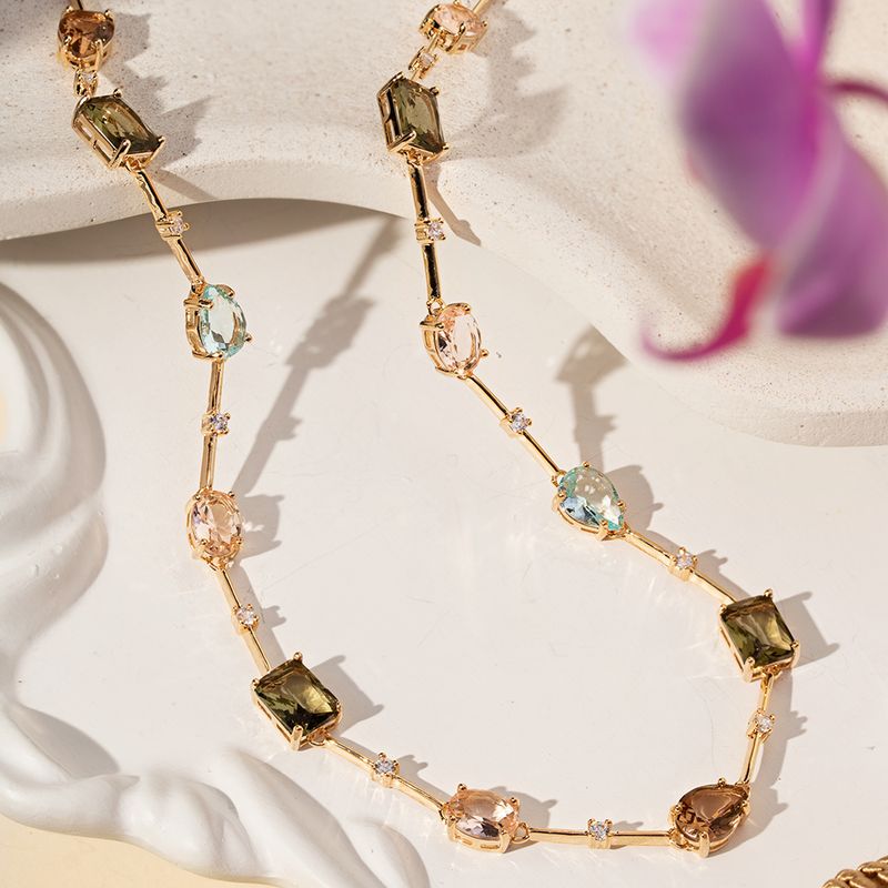 Um colar que é puro encanto! A mistura dos Cristais Morganita, Peridoto e Topázio Fumê fica linda no banho de ouro 18k. Com 45cm, ele é leve, delicado e cheio de estilo — o toque de cor e brilho que faz toda a diferença!
