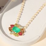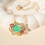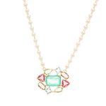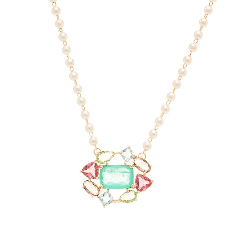 O colar em banho de ouro 18k com 47cm traz design de formas geométricas, com pedras de fusion turmalina, fio de pérolas coreanas com cristais turmalina rosa, berilo, topázio azul, topázio fumê, além de zircônias brancas cravejadas. Uma joia sofisticada e vibrante, perfeita para looks modernos e elegantes.