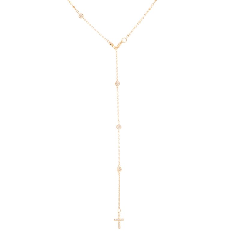 O colar gravatinha em banho de ouro 18k possui 54cm e traz delicados redondinhos cravejados com zircônias brancas, finalizando em um pingente cruz. Uma joia sofisticada e moderna, perfeita para compor looks elegantes e cheios de brilho.
