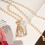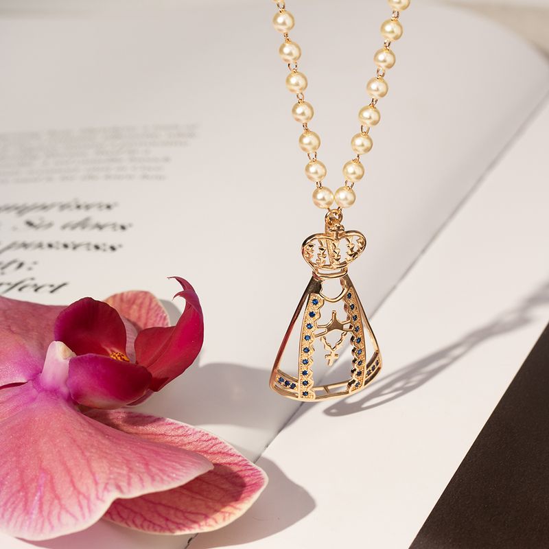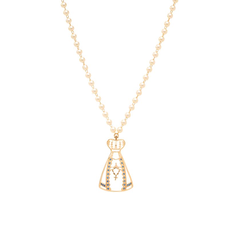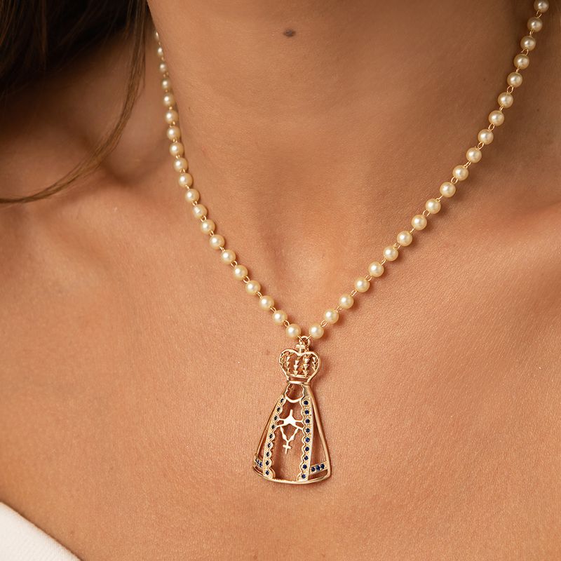 O colar Nossa Senhora Aparecida 35mm traz um design elegante com pérolas coreanas e zircônias azuis que iluminam a peça com suavidade. Com 50cm e banho de ouro 18k, ele combina fé, modernidade e sofisticação jovem. Um colar leve, detalhado e cheio de significado, perfeito para destacar o visual com delicadeza e estilo.