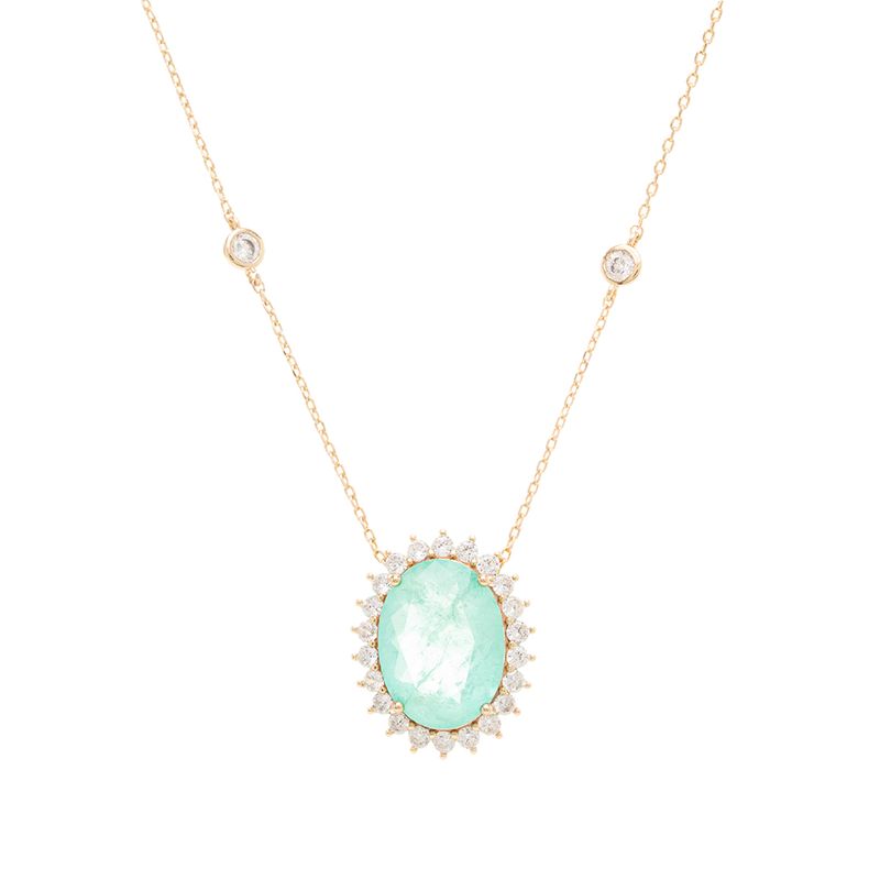 Um verde cheio de vida pra iluminar o look! Colar 50cm em banho de ouro 18k com pingente oval de fusion turmalina cravejado de zircônias brancas. Moderno, vibrante e super sofisticado!