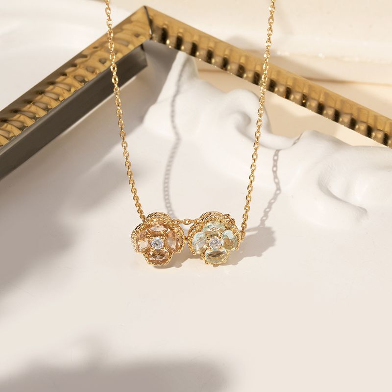 Colar Trevo com Cristal Água Marinha, Cristal Rodolita e Zircônias Brancas 50cm - Banho de Ouro 18k