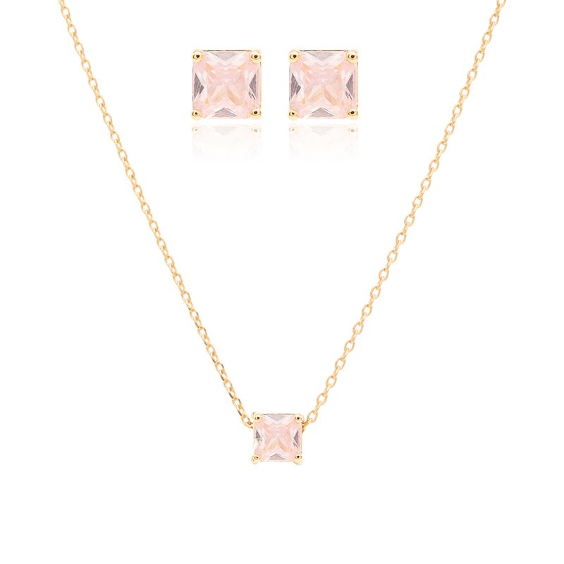 Conjunto Brinco e Colar Quadrado Cristal Light Pink 45cm - Banho de Ouro 18k