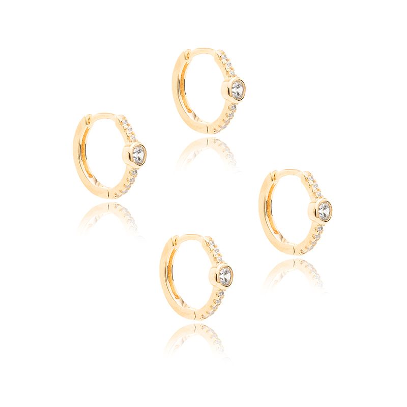 O kit traz 2 pares de brincos de argola em banho de ouro 18k com detalhe ponto de luz de zircônias brancas na cravação inglesa. Uma combinação clássica e sofisticada que une brilho e modernidade, perfeita para compor produções versáteis no dia a dia ou em ocasiões especiais.