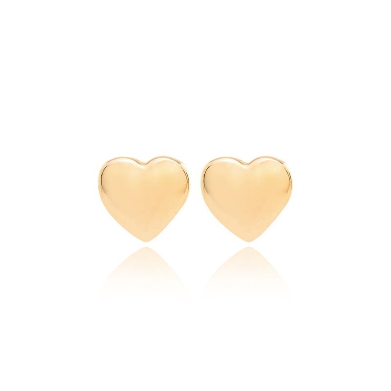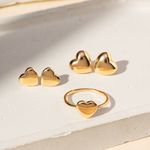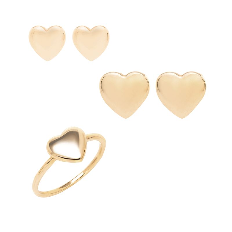 O kit em banho de ouro 18k traz dois pares de brincos lisos em formato de coração (11mm e 9mm) e anel liso combinando. Uma coleção romântica e sofisticada, perfeita para quem busca delicadeza e modernidade em joias coordenadas