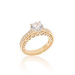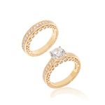 O Anel solitário com zircônia central de destaque em cravação de 4 garras e aparador acompanha com fileira de zircônias brancas e bordas texturizadas. Ambos com banho de ouro 18k, cravação em garras e detalhes em milgrain nas laterais. Design clássico, ideal para compor mix de anéis ou usar como aliança