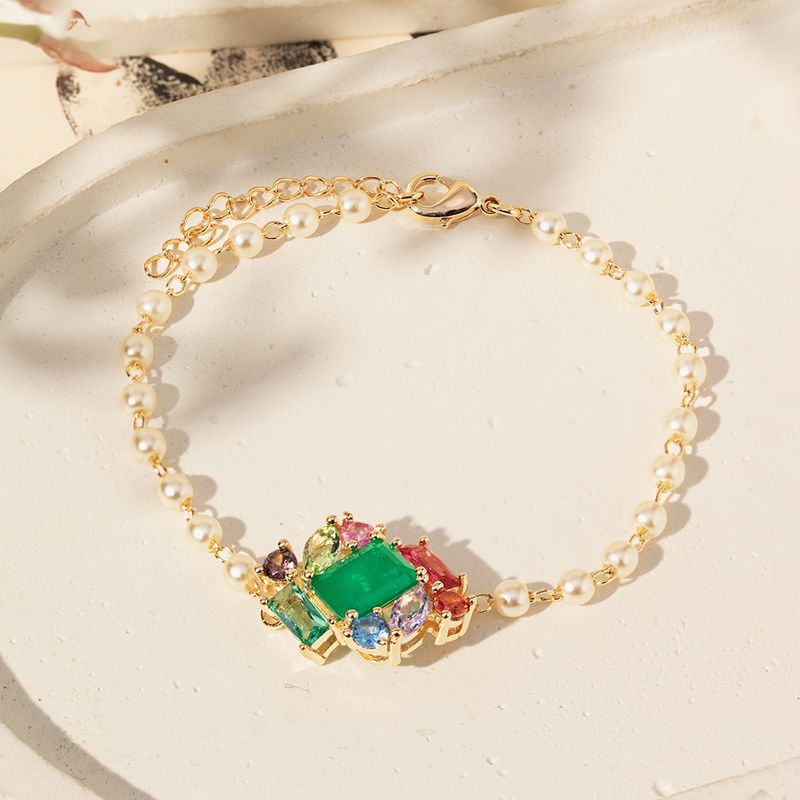 A pulseira combina pérolas coreanas com fusion esmeralda, cristal turmalina rosa e cristal paraiba em um design sofisticado. Com 19cm de comprimento, fecho seguro e banho de ouro 18k, é a peça ideal para quem busca elegância moderna e charme atemporal.