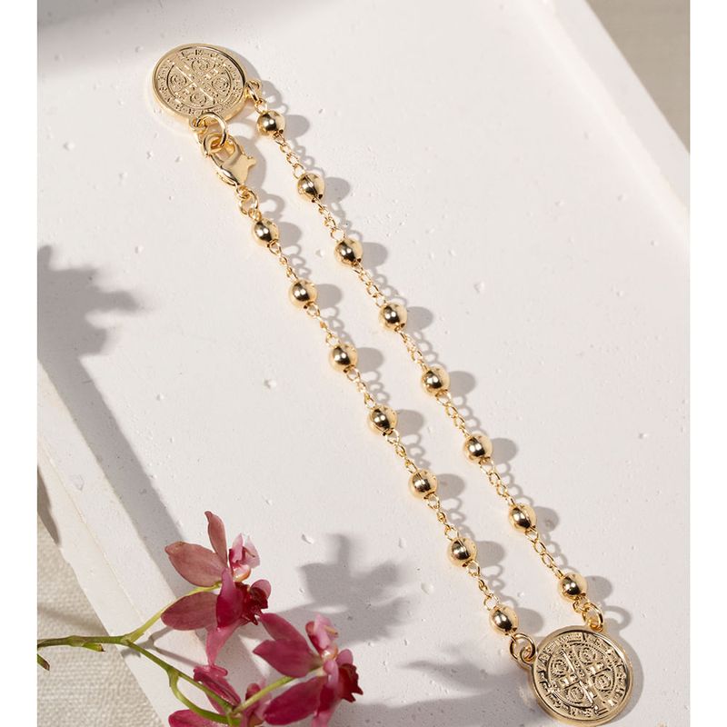 Pulseira lisa com medalha dupla de São Bento, banho de ouro 18k. Com 18cm, é uma peça delicada e cheia de significado, unindo fé e estilo no mesmo design. O brilho do dourado realça as medalhas, criando um acessório moderno, versátil e atemporal para o dia a dia.